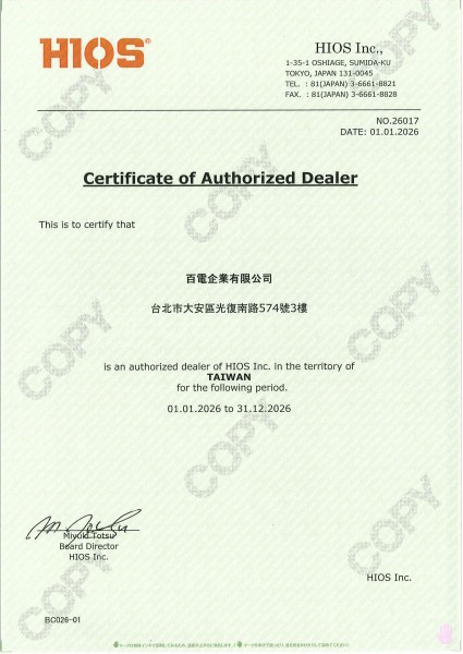 HAKKO原廠代理經銷証書/HIOS原廠代理經銷証書